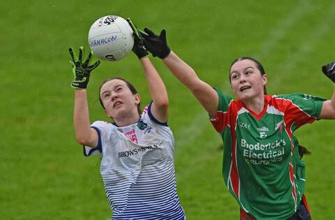 Hollymount's Lily Hession and Carnacon's Shauna Heneghan contest the ball during last Sunday's Mayo LGFA senior championship clash. Pictures: Conor McKeown