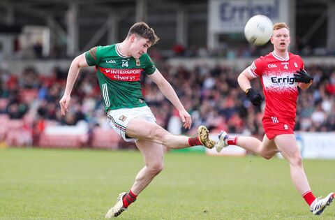 Mayo’s Frank Irwin goes for a score as Derry’s Martin Bradley looks on. Picture: INPHO/Lorcan Doherty