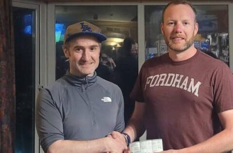 Fergal Killeen (left) accepting the $1,000 cheque from Patrick Ford, former US Marine, whose mother was raised in Mayo.