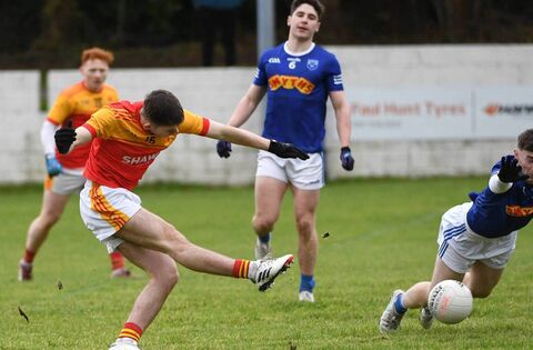 Castlebar Mitchels’ Calum Filan shoots for goal as Sean Niland of Claremorris attempts to block his effort. Pictures: David Farrell Photography