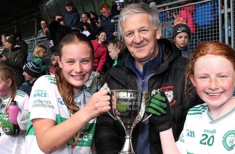 Tony Fahey, Cumann na mBunscol, presents the Division 2A Girls Perpetual Cup to Olivia Gately and Aoibhe Breheny after St Attracta's beat Behy NS in the county final. Pictures: Michael Donnelly