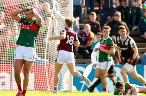 Aidan O’Shea reacts to Galway goalkeeper Connor Gleeson saving a late goal chance by Enda Hession in Mayo's narrow defeat in last Sunday's Connacht SFC final. Picture: INPHO/James Crombie