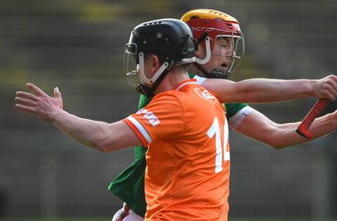 Conor Murray of Mayo has his path blocked by Armagh’s Sean Og McGuinness during Sunday's NHL Division 3A game at Hastings Insurance MacHale Park, Castlebar.. Picture: David Farrell Photography