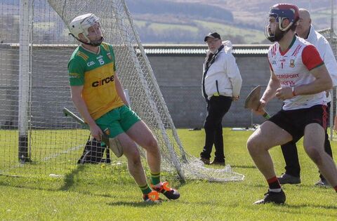 Donegal attacker Ruairi Campbell watches as Mayo goalkeeper Bobby Douglas gather the sliothar behind his goal-line and looks to take a quick puck out. Picture courtesy of Mayo GAA
