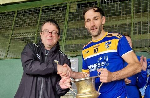 Eastern Gaels captain Joe Boyle accepts the Division 3 trophy from Mayo GAA vice-chairman Con Moynihan. Picture courtesy of Mayo GAA