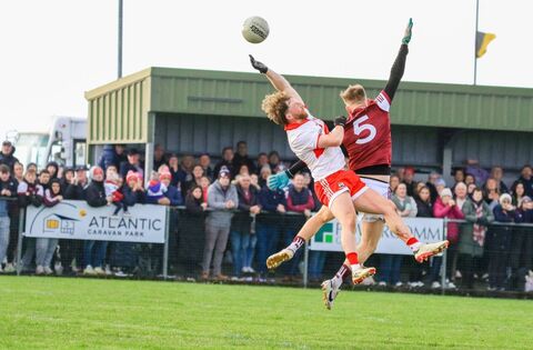 Karl McKenna of Shamrock Gaels takes flight with Conor Burke of Coolera-Strandhill during last Sunday's Sligo SFC final replay in Quigibar, Enniscrone. Picture: Lauren Fitzgerald