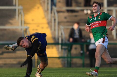 Finbar McLaughlin scores one of Mayo's three first-half goals despite the acrobatics of Roscommon goalkeeper Seán Allen during the Connacht U20 Football Championship Round 1 clash which ended in a draw at Dr Hyde Park. Picture: Bernie O'Farrell