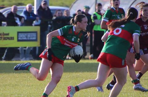 Sarah Carney, who scored two points, sends Mayo on the offensive in the Green and Red's victory over Galway in the round-robin phase of the Connacht LGFA minor championship. Picture: Pauline Flatley/Mayo LGFA