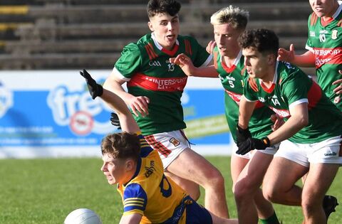 Mayo’s Evan Walsh, David Hurley, Conor Moriarty and Harry McHale surround Roscommon captain Keelan Kelly during last month's meeting of the teams in Round 1 of the Electric Ireland Connacht U17 football championship. Picture: David Farrell Photography