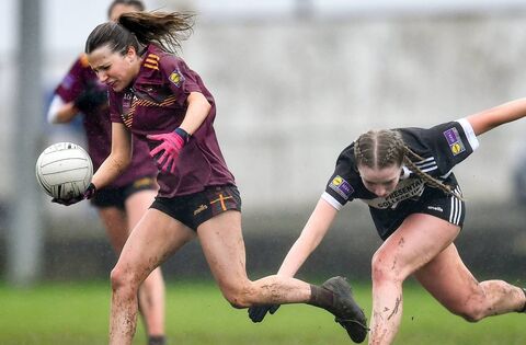 Cecilia French of St Ronan's College in action against Katie O Connor of Presentation College during the 2024 Lidl All-Ireland Junior Post-Primary Schools Junior B Championship final between Presentation College Headford, Galway and St Ronans College, Lurgan, Armagh at Mullahoran in Cavan. Picture: Stephen Marken/Sportsfile.