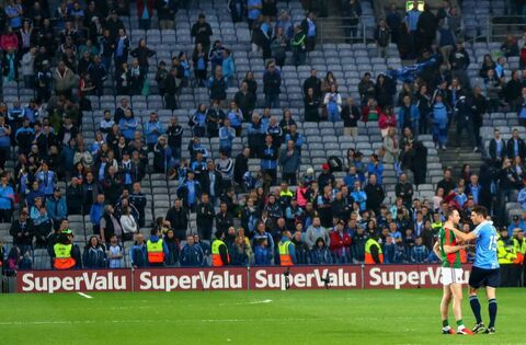 Mayo defender Keith Higgins is consoled by Dublin's Bernard Brogan after the 2016 All-Ireland SFC Final replay. Brogan, whose family roots are in Knockmore, is one of six Dublin players to be included in the Irish Independent's 'Team of the Quarter Century' while Keith Higgins is the only Mayo player to make the cut, despite a total of eight nominations. Picture: INPHO/James Crombie