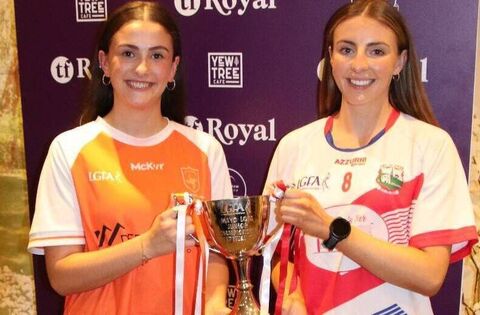 Ava McDonnell, the captain of St Brigid's, and Mairead Mooney, the captain of Aghamore, with the Mayo LGFA Junior Championship trophy in advance of this Friday night's final. Picture: Pauline Flatley