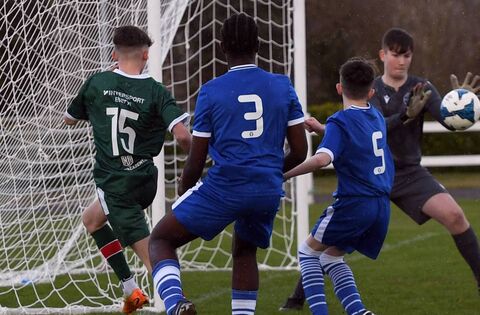 Mayo FC’s Paddy Hope has his effort saved by Limerick goalkeeper Dean Connery during the League of Ireland Academy Group C U15 tie at Umbro Park, Castlebar, in February. Picture: David Farrell Photography