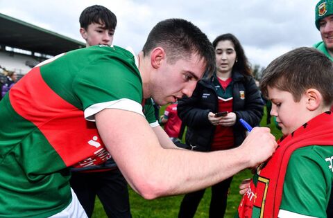 Mayo footballer Enda Hession signs a jersey for 10-year-old fan Michael Walsh from Ballycastle, after the Allianz Football League Division 1 match between Monaghan and Mayo at St Tiernach's Park in Clones, last Sunday. Picture: Ben McShane/Sportsfile