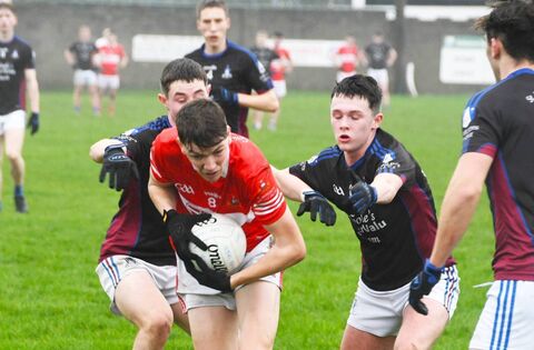 St Muredach's midfielder Oisin Gavin powers through the tackles of his St Jarlath's opponents in last Wednesday's opening round game in the Connacht Post Primary Schools senior 'A' football championship. Pictures: John O'Grady