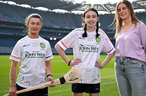 Féile veteran and John West Féile 2025 Ambassador, inter-county camogie star Aoife Donohue, Galway, with Whitehall Colmcille's Caoimhe Mooney and her mother Sharon Mooney at the launch in Croke Park of John West Féile 2025. The event marked 10 years sponsorship by the company. Pic: David Fitzgerald/Sportsfile.