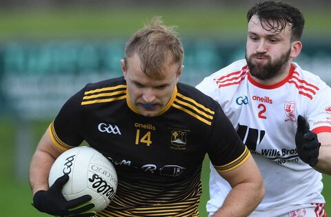 Lahardane’s James Maughan shields the ball from Moy Davitts Paul Byrne during the Egan Jewellers Mayo IFC at James Stephens Park, Ballina, last Saturday. Picture: David Farrell Photography