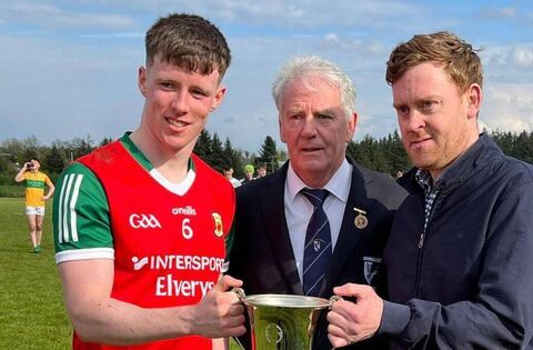 Mayo captain Sean Morahan accepts the Philly McGuinness Cup from Michael McGuinness in the company of Connacht GAA secretary Vincent Neary.