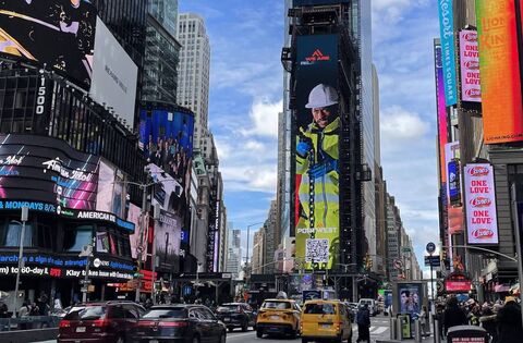 Mayo workwear company Portwest advertising in Times Square, New York on Friday, April 5, 2024, shortly before the city was struck by it's largest magnitude earthquake in 140 years.