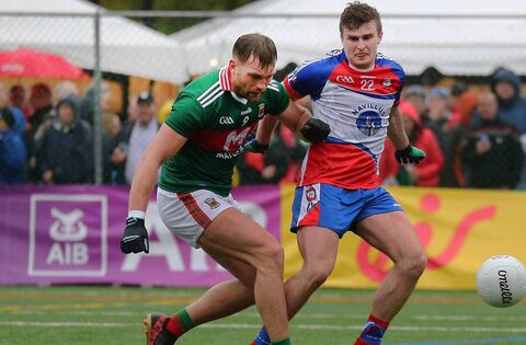 Aidan O'Shea, seen in action against Kevin Finn of New York in 2019, will set a new record for league and championship appearances having been named in a strong Mayo line-up for Sunday's Connacht SFC quarter-final at Gaelic Park. Picture: INPHO/Andy Marlin