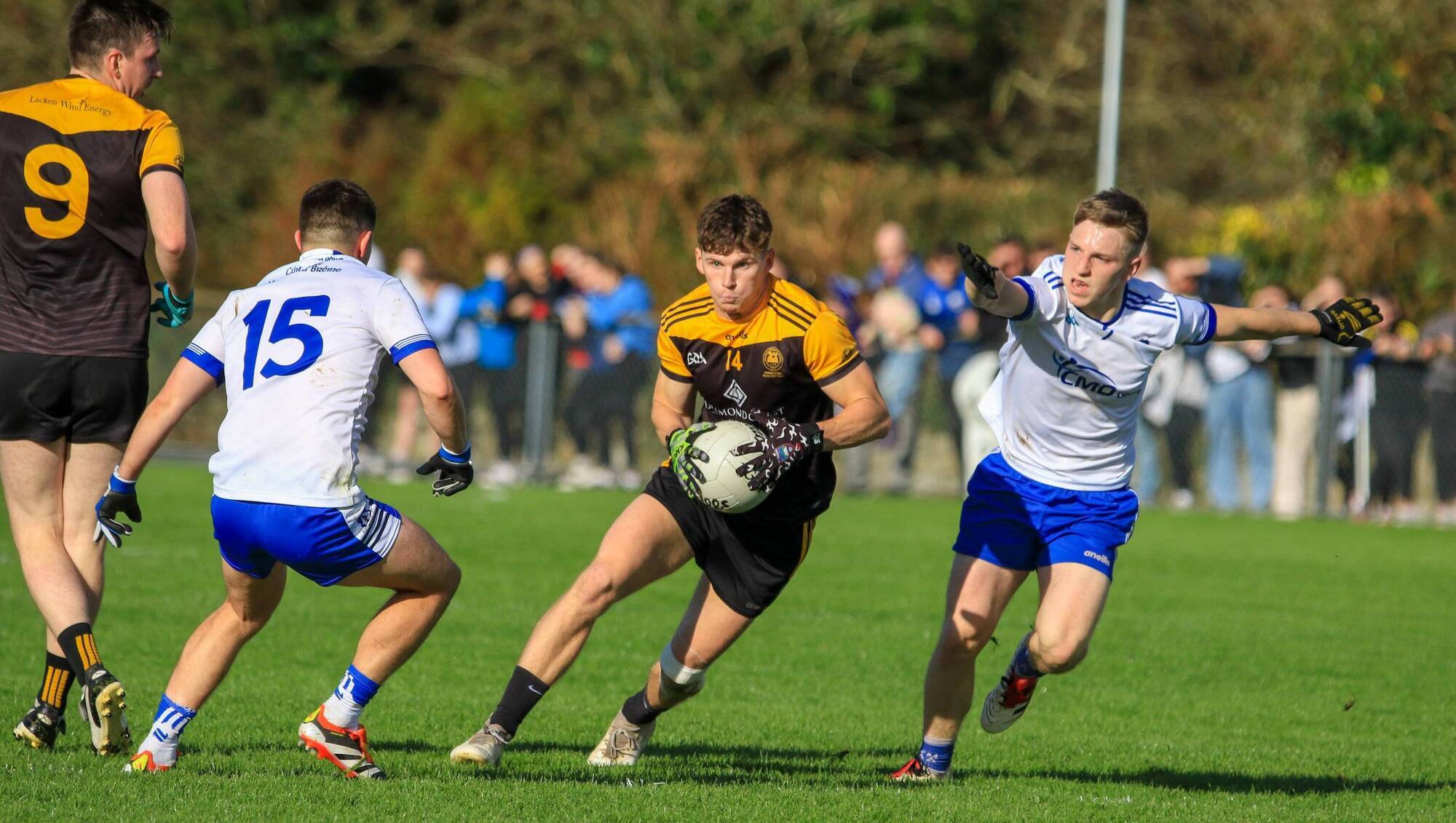 Gavin Duffy of Enniscrone-Kilglass makes for a gap in the Coolaney-Mullinabreena defence during last Sunday's Sligo IFC final in Kilcoyne Park, Tubbercurry. Pictures: Lauren Fitzgerald