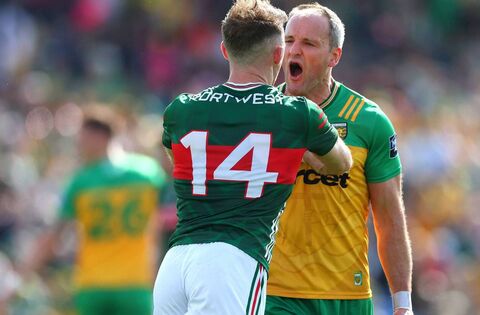 Mayo’s Darren McHale argues with Michael Murphy of Donegal during Sunday's third round clash in All-Ireland SFC Group 1. Picture: INPHO/James Crombie
