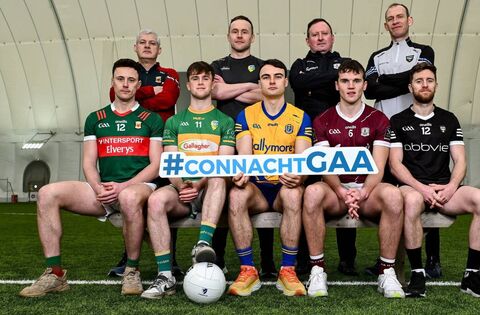 At the launch of the 2024 Connacht SFC at the Centre of Excellence in Bekan were front row from left, Diarmuid O'Connor of Mayo, Jack Casey of Leitrim, Conor Hussey of Roscommon, John Daly of Galway and Keelan Cawley of Sligo and back row from left, Mayo manager Kevin McStay, Leitrim manager Andy Moran, Galway selector John Concannon and Sligo selector Noel McGuire. Pictures: Piaras Ó Mídheach/Sportsfile