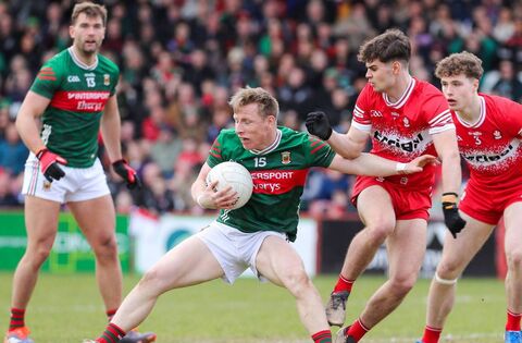 Mayo’s Ryan O’Donohue holds off Derry’s Patrick McGurk. Picture: INPHO/Lorcan Doherty
