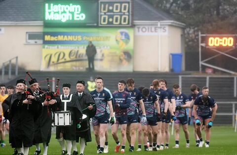 Mayo Mayo make their way behind the Kiltubrit Pipe band in the pre match parade. Pictures: INPHO/Evan Logan