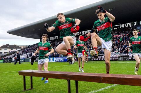Mayo’s Ryan O’Donoghue and Enda Hession take to the field in Pearse Stadiujm last Sunday for the NFL Division 1 game against Galway. Picture: INPHO/James Crombie