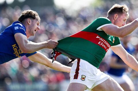 Cavan's Brian O'Connell using all means to try and halt the gallop of Ryan O'Donoghue of Mayo at MacHale Park last Saturday. Picture: INPHO/Tom Maher