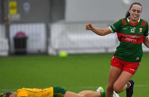 Mayo’s Maria Cannon celebrates scoring a goal against Meath during the Lidl LGFA National Football League Rd 1 fixture at the COE Airdome, Bekan, last Sunday. Picture: David Farrell Photography