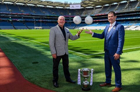 25 July 2024; In attendance at a photocall at Croke Park to announce O’Neills as new title sponsors of the LGFA’s All-Ireland Club 7s competition was Cormac Farrell, left, Business Marketing Manager of O’Neills with Mícheál Naughton President of the LGFA Photo by Matt Browne/Sportsfile
