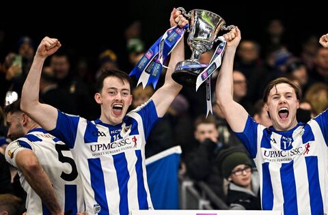 Ballyboden St Enda's players Ryan Baynes, left, and Kieran Kennedy, lift the Seán McCabe Cup after their side's victory in the AIB Leinster GAA Football Senior Club Championship final match between Athy of Kildare and Ballyboden St Enda's of Dublin at Croke Park in Dublin. Picture: Seb Daly/Sportsfile