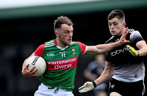 Darren McHale of Mayo fends off Sligo's Karl McKenna during the 2021 Connacht SFC quarter-final at Markievicz Park in Sligo. Picture: David Fitzgerald, Sportsfile