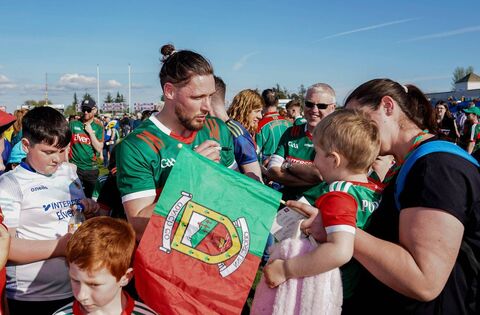 Padraig O’Hora, who was introduced as a second-half substitute, meets some delighted Mayo fans after the game. Pictures: INPHO/James Lawlor