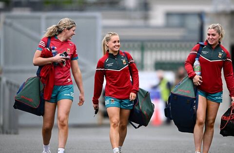 9 June 2024; Mayo players, from left, goalkeeper Laura Brennan, Éilís Ronayne, and Maria Reilly arrive before the TG4 All-Ireland Ladies Football Senior Championship Round 1 match between Dublin and Mayo at Parnell Park in Dublin. Photo by Seb Daly/Sportsfile.
