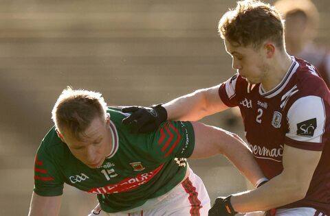 Allianz Football League Division 1, Hastings Insurance MacHale Park, Castlebar 2/2/2025 Mayo vs Galway Mayo’s Ryan O'Donoghue and Johnny McGrath of Galway Mandatory Credit ©INPHO/James Crombie