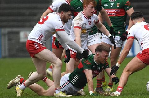Mayo’s Darren McHale is surrounded by Tyrone players during last weekend's Allianz Football League Division 1 encounter at Hastings Insurance MacHale Park, Castlebar. Picture: David Farrell Photography