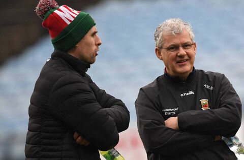 Mayo manager Kevin McStay shares a joke with Paddy Durcan prior to last Sunday's game. McStay confirmed afterwards that Durcan will make his long awaited return from injury before the end of the league campaign.