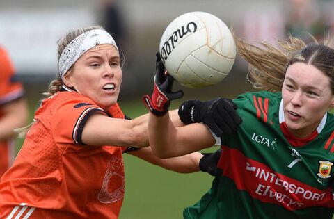Mayo’s Jenna Mortimer manages to grab the ball ahead of Armagh’s Lauren McConville during the Lidl Ladies NFL Division 1 tie at James Stephen’s Park, Ballina, last Sunday. Picture: David Farrell Photography