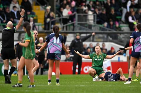 Vikki Wall of Meath reacts to referee Kevin Phelan's decision to call for her challenge on the grounded Sinead Walsh of Mayo during the LGFA National League Division 1 match at Páirc Tailteann in Navan. Pictures: David Fitzgerald/Sportsfile