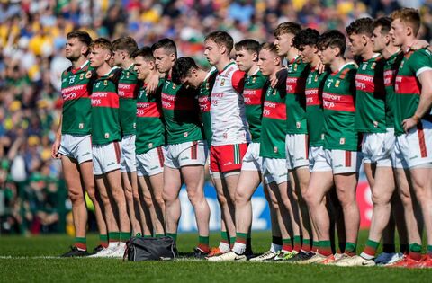 The Mayo team stands for the National Anthem before last Sunday's Connacht SFC semi-final against Roscommon at Dr Hyde Park. Picture: INPHO/James Lawlor
