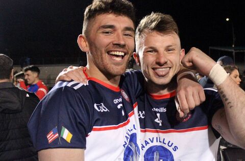 New York footballers Connell Ahearne and Eoghan Kerin celebrate after last year's dramatic win against Leitrim at Gaelic Park.