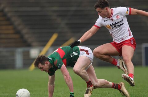 Mayo midfielder Matthew Ruane is challenged by Michael McKernan of Tyrone during last Sunday's NFL Division 1 encounter in Castlebar. Picture: INPHO/James Crombie