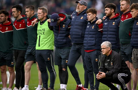 Mayo manager Kevin McStay, bottom, and backroom staff during last Saturday's penalty shoot-out defeat to Derry. Picture: Seb Daly/Sportsfile