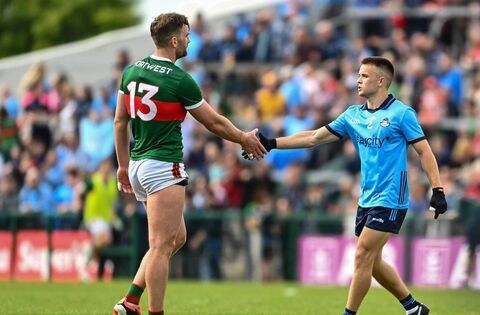 Aidan O'Shea and Eoin Murchan shake hands following last Sunday's stalemate between Mayo and Dublin in Round 3 of the All-Ireland SFC at Dr Hyde Park, Roscommon. Picture: Daire Brennan/Sportsfile