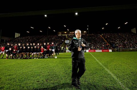 Mayo manager Kevin McStay ponders the game ahead as his players pose for the pre-match photograph in advance of their clash with in Austin Stack Park, Tralee, last Saturday night. Pictures: INPHO/James Crombie