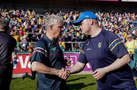 Mayo manager Kevin McStay is congratulated by his Roscommon counterpart Davy Burke after the game at Dr Hyde Park last Sunday afternoon. Picture: INPHO/James Lawlor