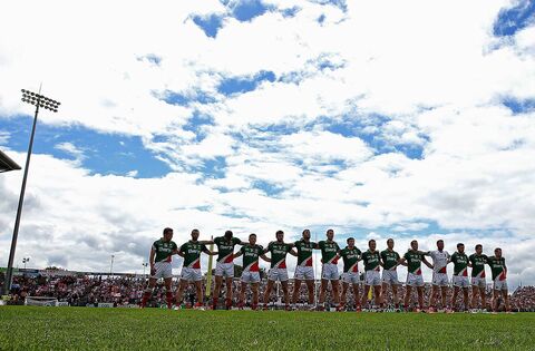Mayo senior footballers line up for the National Anthem ahead of their Connacht Senior Football Championship Final against Galway in MacHale Park, Castlebar in 2014. It was the last time the two sides met in a provincial decider in Castlebar and it was also the last time a four-in-a-row was completed in the province - Mayo defeating their old enemy to win their fourth successive title. Picture: INPHO/Donall Farmer